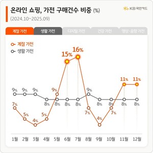 KB국민카드는 최근 1년간 온라인 쇼핑을 통해 발생한 가전제품 구매 데이터를 분석한 결과, 계절별로 품목별 수요가 뚜렷하게 구분된다고 18일 밝혔다.분석은 2024년 10월부터 2025년 9월까지 KB국민카드 신용·체크카드로 결제된 약 490만 건의 온라인 가전 구매 데이터를 기반으로 진행됐다. 가전은 계절가전(난방·냉방·환경)과 생활가전(주방·가사·이미용·보안)으로 구분해 월별 구매 비중을 비교했다.계절가전은 여름철(6~7월) 31%, 겨울철(11~12월) 22%로 특정 계절에 구매가 집중됐다. 반면 생활가전은 월별 8% 내외로